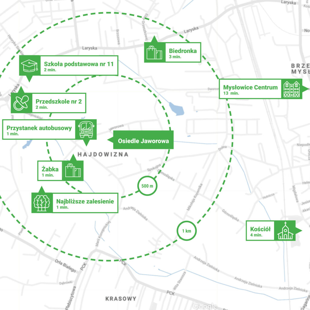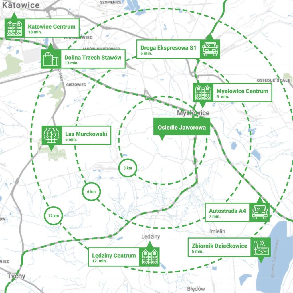Kameralne osiedle 7 działek budowlanych, w cichej, bezpiecznej oraz zielonej okolicy z bardzo komfortowym dojazdem zarówno do centrum Mysłowic, jak i serca Katowic.